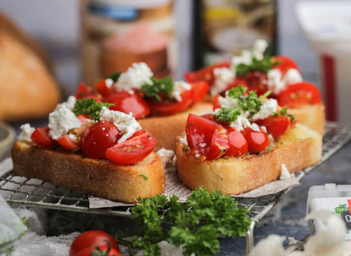 Čeri paradajz isecite na četvrtine pa stavite u jednu činiju. Prelijte sa malo maslinovog ulja koje ste pripremili na početku pa dobro izmešajte. Poređajte na zapečene kriške somuna. Preko stavite malo sira i prelijte ostatkom preliva.