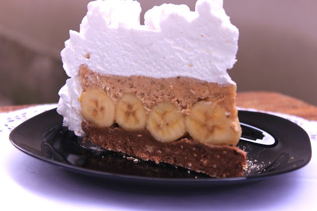 Na dno tacne, kalupa, tepsije poravnajte čokoladni deo, potom banane koje ste predhodno ogulili i poprskali limunovim sokom. Odgore stavite svetli deo, lepo zagladite pa ukrasite šlagom.