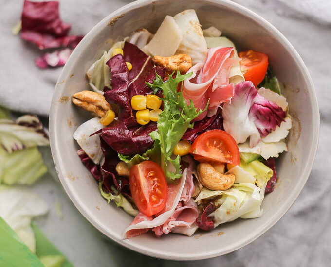 U teglicu satvite sve sastojke za dresing i dobro, dobro izmućkajte. U činiju za salatu stavite mix i ostalo povrće pa prelijte dresingom i dobro, dobro izmešajte. Po vašem ukusu možete dodati listiće parmezana i malo pršute.