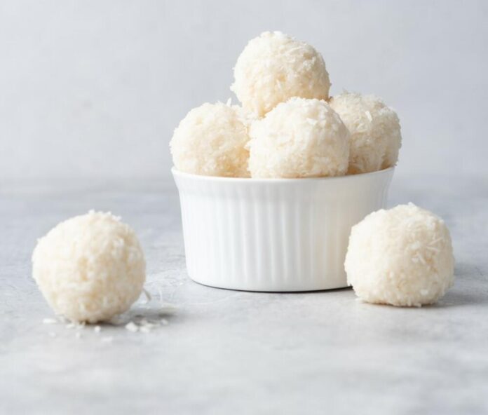 U posudi izmešajte kokosovo brašno i kondenzovano mleko, pa ostavite nekoliko minuta da se sastojci sjedine.