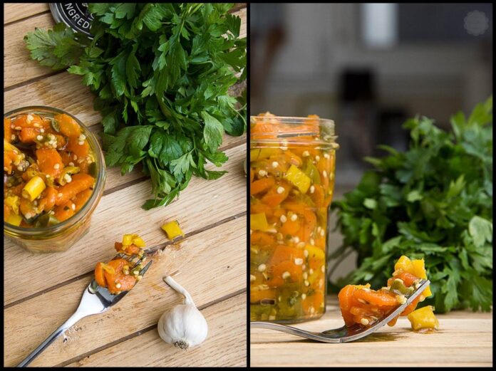 U posebnoj činiji sam pomešala maslinovo ulje, šećer, so, sitno seckan peršun i biber. Time sam prelila šargarepu sa papričicama i dobro promešala. Sipala sam salatu u tegle, malo po malo, stalno pritiskajući kašikom da istisnem preostali avzduh ako ga negde ima. Napunila sam tegle skoro do vrha i dobro ih zatvorila.