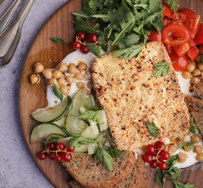 Leblebije procedite i operite pod mlazom hladne vode pa pomešajte sa maslinovim uljem i začinima. Na dasku ili tanjir za serviranje stavite grčki jogurt. Preko rasporedite zečinjene leblebije, pa preko stavite prohlađenu pečenu fetu. Dodajte svežu salatu, peršun i prelijte preostalim uljem od leblebija.