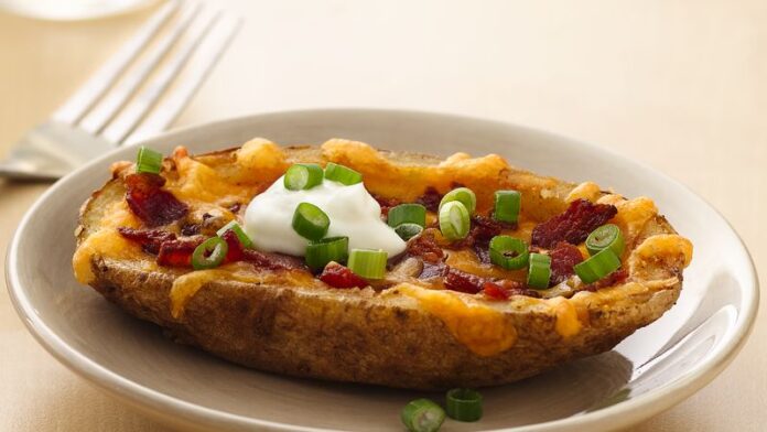Pred kraj pečenja po površini krompira stavite seckanu slaninu i tvrdi sir, po želji, pa zapecite da se sir istopi.