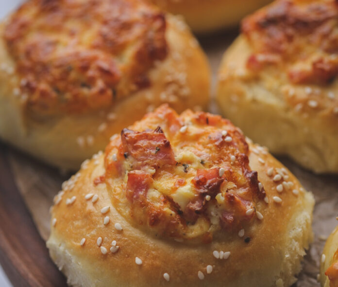 Zatim, pripremite fil. Pomešajte jaje, krem sir i začine, pa dodajte ostale sastojke i dobro sjedinite. Testo premesite, pa podelite na 16 jednakih delova. Napravite loptice, pa svaku blago pritisnite oklagijom da rastanjite. U sredini prstima napravite udubljenje, pa stavite na pleh obložen papirom za pečenje. Nafilujte pripremljeno testo, pa ivice premažite jajetom i pospite susamom. Pecite 25-30 minuta u rerni zagrejanoj na 180 stepeni.