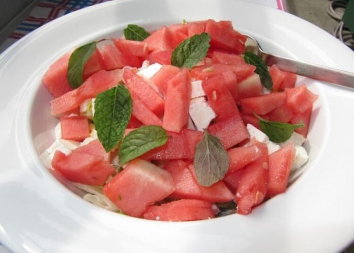 Isecite krastavac i lubenicu na kocke, pa pomešajte sa listićima nane i izmrvljenom fetom.