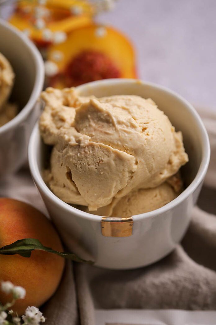 Kada je sve ohlađeno, u blender sipajte mešavinu bele čokolade i slatke pavlake, zajedno sa pečenim breskvama i kondenzovanim mlekom* (koje možete i izostaviti a njegovu slast zameniti sa malo šećera u prahu). Dobro izmiksajte. Ali zaista, izmiksajte tako da ne ostane ni jedan komadić breskve i da tekstura bude potpuno glatka.