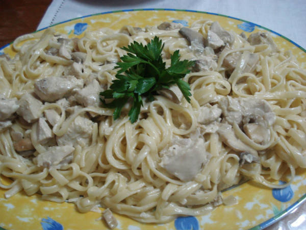 Skuvajte taljatele i kad ih ocedite stavite puter i promešajte. Dodajte taljatele u piletinu i opet promešajte. Pospite seckanim peršunom.