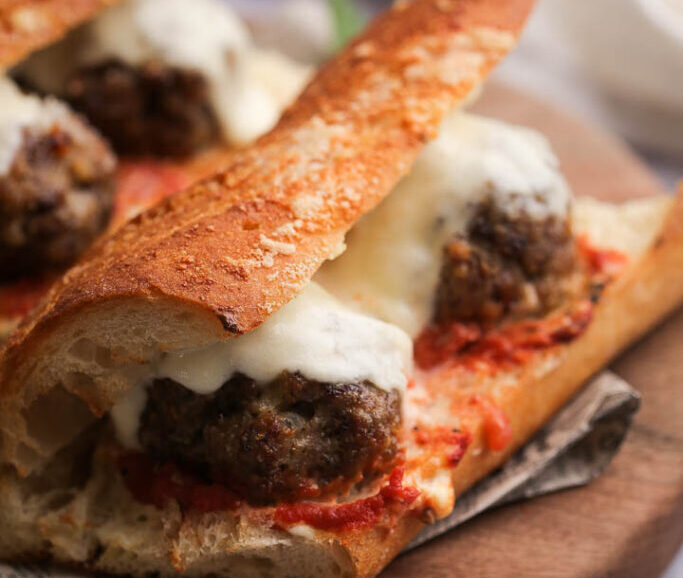 U međuvremenu pripremite hleb tako što ćete ga iseći na komade onoliko velike koliko vama odgovara i srazmerno veličini ćuftica. Ja sam baget sekla tako da dve velike ćufte stanu u jedan sendvič. Presecite poprečno ali ne do kraja. Premažite maskarpone sirom, pa na donju stranu stavite dve kašike paradajza. Preko smestite ćufte, pa preko ćufti stavite po jedan komad mocarele. Ukoliko je potrebno, hleb pričvrstite štapićima za ražnjiće. Premažiteputerom gornju stranu, pa pospite parmezanom. Ređajte na isti pleh na kojem su se pekle ćufte da hleb pokupi sve one divne ukuse koje su ćufte pustile tokom pečenja.