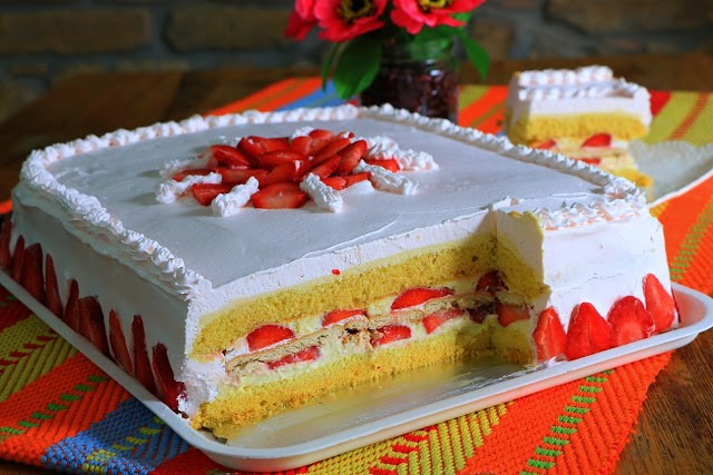 Velika torta za puno gostiju, sa vanila filom i svežim jagodama. Umesto jagoda može i drugo voće ili kombinacije raznog voća.