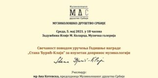 Sutra uručenje nagrade Stana Djurić Klajn Muzikološkog društva Srbije