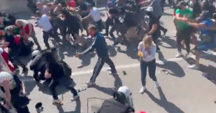 Na Tviteru je osvanuo snimak sukoba policije i demonstranata. Masa juriša ka policiji i probija kordon, a pripadnike policije gađaju i guraju.