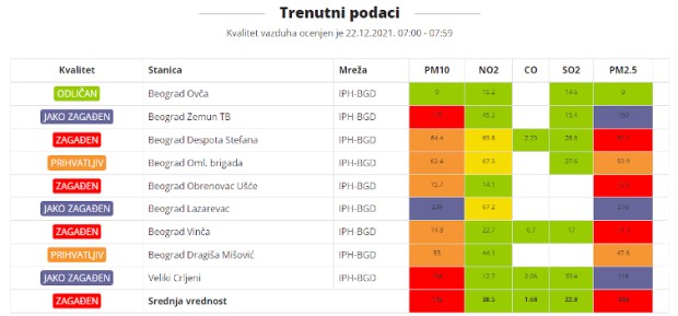 Prema sajtu Beoeko jako zagađen vazduh udišu stanovnici naselja Zemun, Lazarevac i Veliki Crljeni.