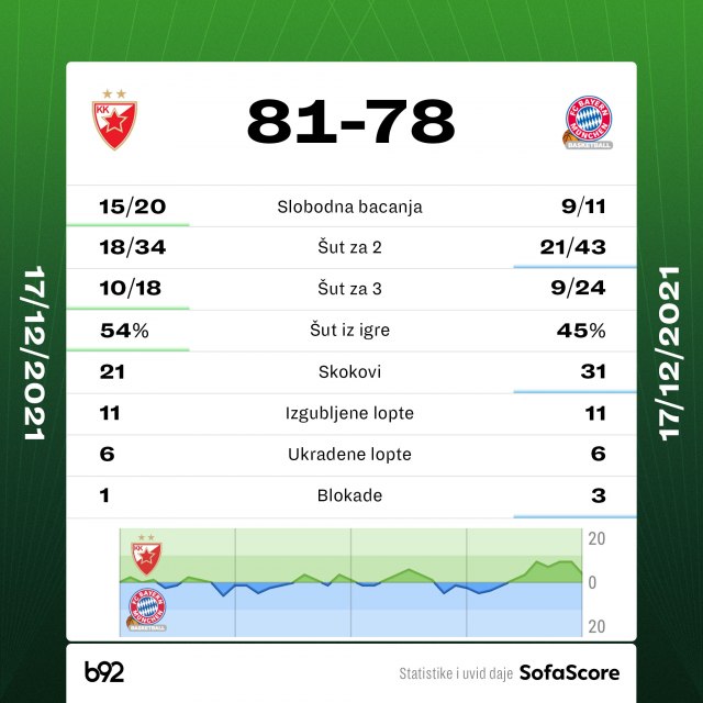 Mitrović je pogodio jedno bacanje za +6, Jaramaz je pogodio trojku za -3, ali je Zvezda potrošila vreme preostalo i došla do pobede.
