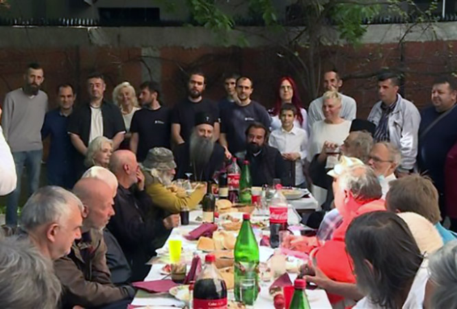 U dvorištu crkvene kuhinje Verskog dobrotvornog starateljstva patrijarha je za stolom sačekalo 20 korisnika, većina njih bez krova nad glavom.