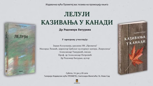 U Galeriji Izdavačke kuće Prometej, u novosadskoj Ulici Svetozara Miletića održaće se promocija knjiga dr Radomira Baturana: ”Leluji” i ”Kazivanja u Kanadi”.