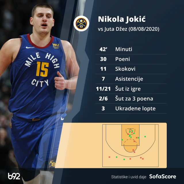 Odgovornost je preuzeo Mičel ali uspeo samo da uputi neprecizan šut sa pola terena – i kraj je konačno sviran.U ekipi Denvera se pored pomenutog Jokića istakao i Majkl Porter Džunior sa 23 poena i 11 skokova. Isti broj poena imao je i povratnik Marej, koji je upisao i 12 skokova i osam asistencija.
