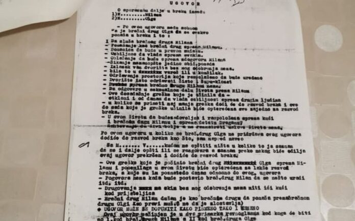 “Pre pola veka brakovi u Srbiji bili su mnogo drugačiji nego danas. Znalo se ko vozi traktor, a ko otvara kapiju, a ukoliko ne bi bilo onako “kako Bog zapoveda” onda bi se kod sudije nosili papiri za razvod. To je učinio i Sredoje, davne 1963. godine, jer mu se, kako je navedeno u dokumentima, učinilo da njegova supruga Milesa “svraće kod komšije češće nego što bi trebalo, a i selo je počelo da priča kako između njih dvoje nešto ima” i to ovaj seoski domaćin više nije mogao da trpi već je zatražio razvod”, rekao je jedan od izvora koji je imao uvid u neobičan ugovor.