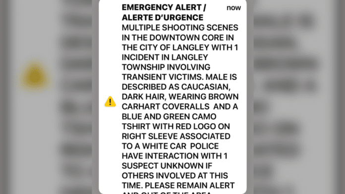 Služba za Hitna upozorenja poslala na mobilne telefone u B.C. upozorenje na pucnjavu u Lengliju u ponedeljak ujutro. Upozorenje je poslato oko 6:20 ujutru, u kojem se navodi da se incident dogodio u centru grada Lengli i u gradu Lengli. Rečeno je da su u incidentu bile uključene “prolazne žrtve”.
