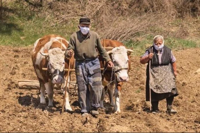 U selu Gornja Temska kod Pirota fotograf Zoran Milić uslikao je jedan stariji par kako radi na njivi sa maskama preko lica.
