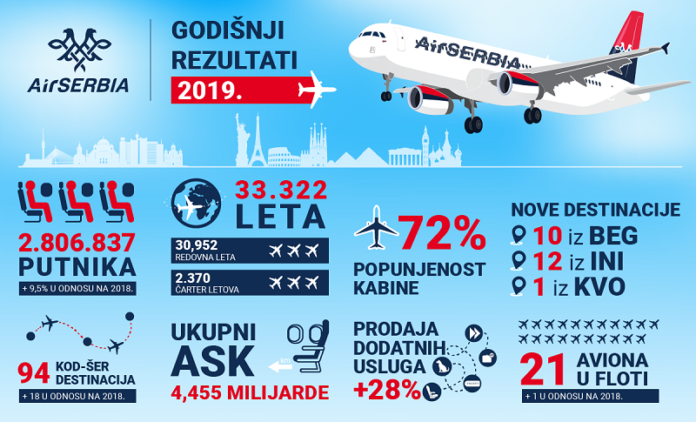 Avio-kompanija je tokom godine prevezla ukupno 2,81 miliona putnika na redovnim i čarter letovima iz Beograda, što predstavlja rekordan rezultat od kada posluje kao Er Srbija. Broj prevezenih putnika porastao je za 9,5 odsto, u odnosu na 2018. godinu.
