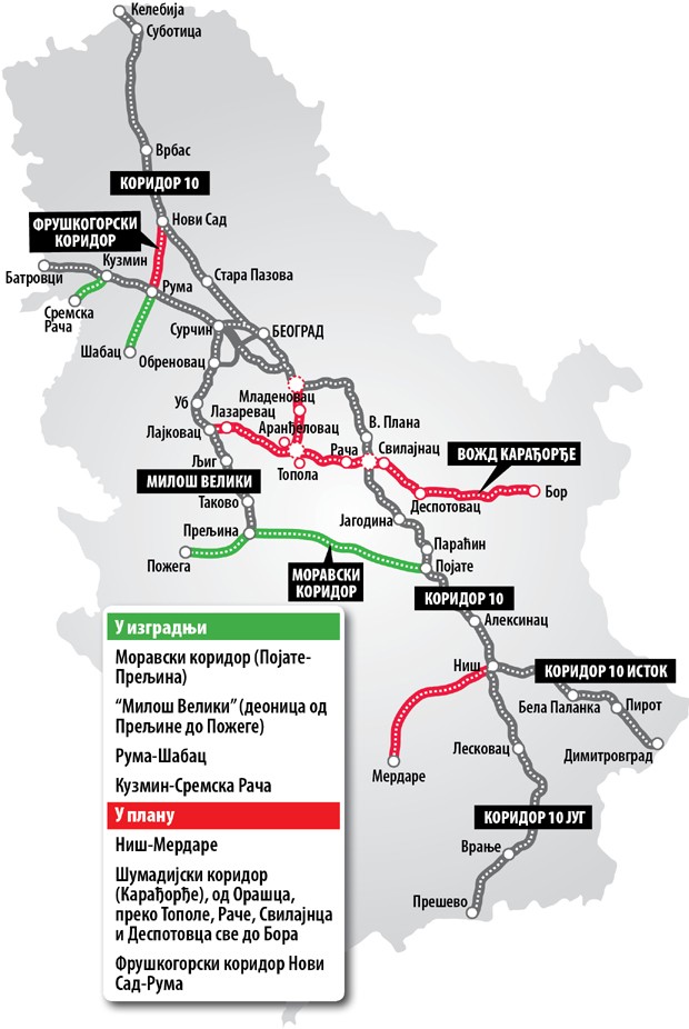 Očekuje se završetak poteza na “Milošu Velikom” od Preljine do Požege, zatim saobraćajnice od Rume do Šapca, deonice auto-puta Sremska Rača – Kuzmin, kao i cele trase Moravskog koridora od Pojata do Preljine. Dogodine bi trebalo da počnu radovi i na auto-putu koji će povezati Niš i Merdare, odnosno Prištinu, a narednih godina i na Šumadijskom koridoru, koji bi trebalo da poveže Šumadiju i istočnu Srbiju. Planirano je da se protegne od Orašca, gde je Karađorđe podigao Prvi srpski ustanak, preko Topole, Rače, Svilajnca i Despotovca sve do Bora. “Nacrtan” je i Fruškogorski koridor od Rume do Novog Sada.