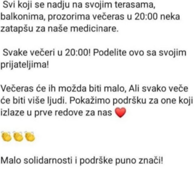 “Svake večeri u 20 sati. Podelite ovo sa svojim prijateljima! Večeras će ih možda biti malo, ali svake večeri će biti sve više ljudi. Pokažimo podršku za one koji izlaze u prve redove za nas. Malo solidarnosti i podrška puno znači!”, navedeno je u objavi koja kruži mrežama.
