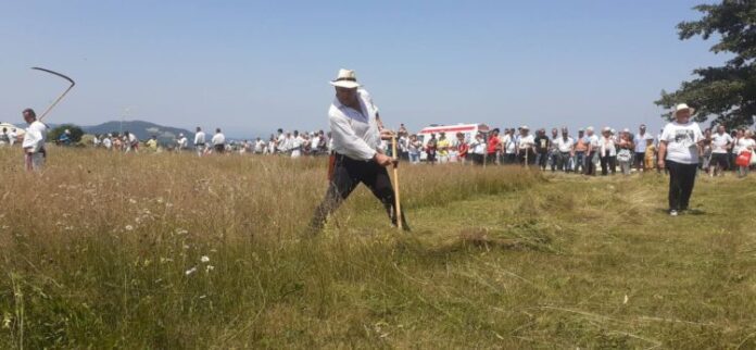 U nedelju, tačno u podne, počelo je revijalno košenje trave, za merak i dušu, uz pesmu, podvriskivanje, trubače, vodonoše, ručkonoše, zdravičare.