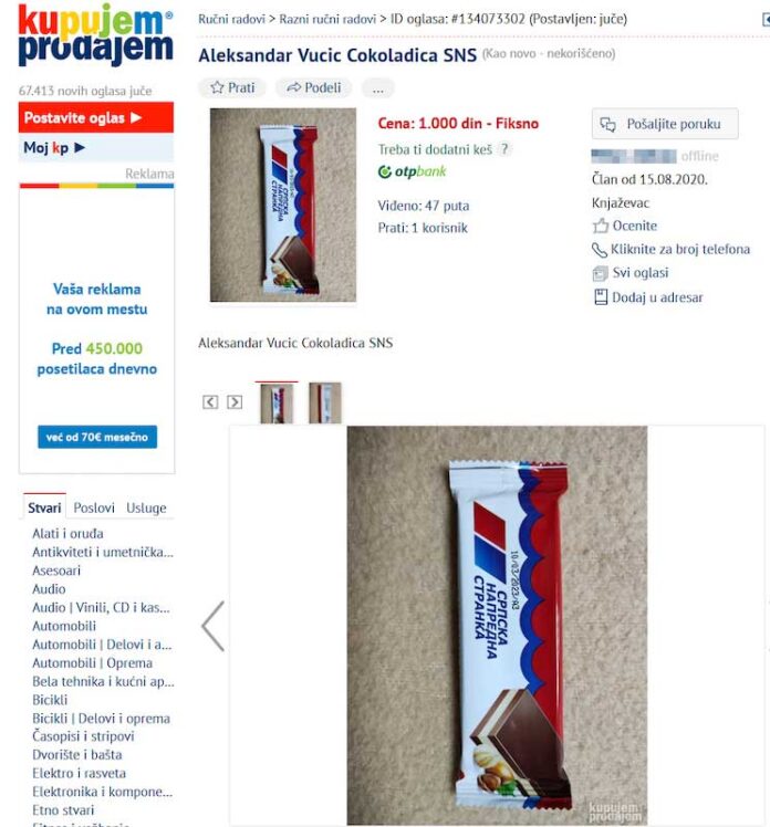Naime, jedan Knjaževčanin je na popularnoj platformi za kupovinu i prodaju ponudio neotvorenu (kao novu) čokoladicu koja se deli u sklopu SNS kampanje, a njenu vrednost procenio je na neverovatnih 1.000 dinara.