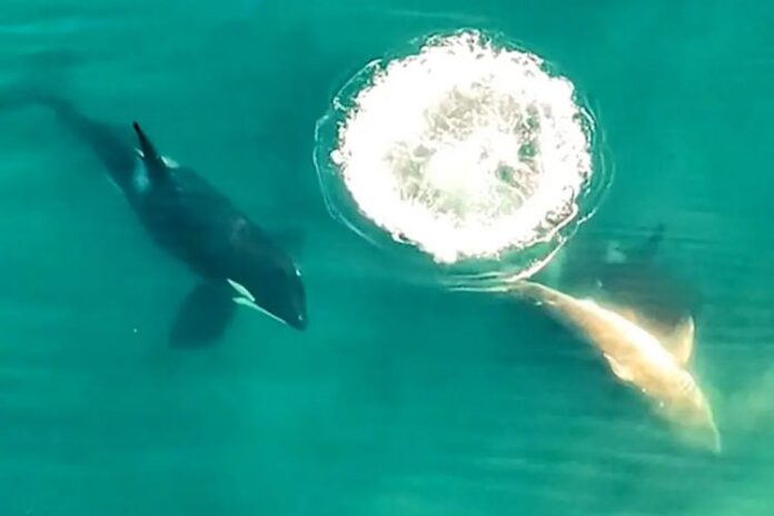 Snimak iz drona podelila je emisija Šark vik (Shark Week) kanala „Diskaveri“, tek nekoliko nedelja nakon što je objavljena studija o dva kita-ubice koji oko obala Južne Afrike terorišu velike bele ajkule, čija beživotna tela često pronalaze na plažam