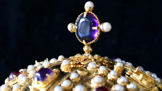 Kruna je teška 1,6 kilograma, ima 24 rubina, 18 safira, 23 ametista, 4 lapis lazulija i čak 407 bisera i rađena je u 13 tehnika.