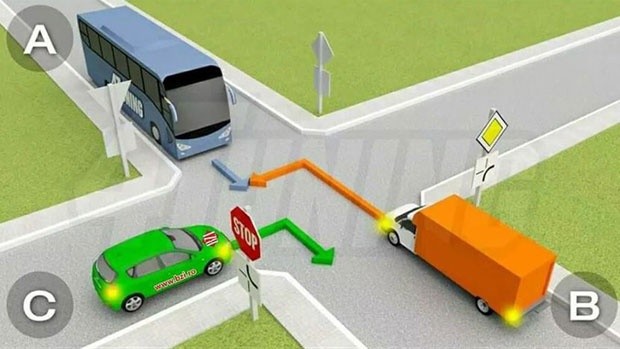 Kao što se može videti na slici, na raskrsnici na kojoj nema semafora nalaze se kamion, automobil i autobus. Kamion treba da skrene levo, automobil desno dok autobus ide pravo. Kojim će redosledom ići?